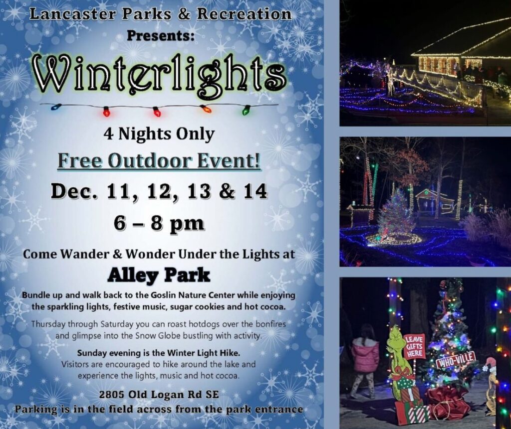 Charles Alley Memorial Park has been a city park with the Lancaster Parks and Recreation Department since 1978. This 350-acre park hosts many fun and important events for the community including a Maple Tapping Festival, Frontier Spirit, Pumpkin Hike, Days of Knights, Santa & Friends, and a multitude of field trips and programs for both students and adults. The park has several outdoor picnic areas, 7 miles of hiking trails, 2 lakes, a disc golf course, a log cabin, a covered bridge, and the Goslin Nature Center.